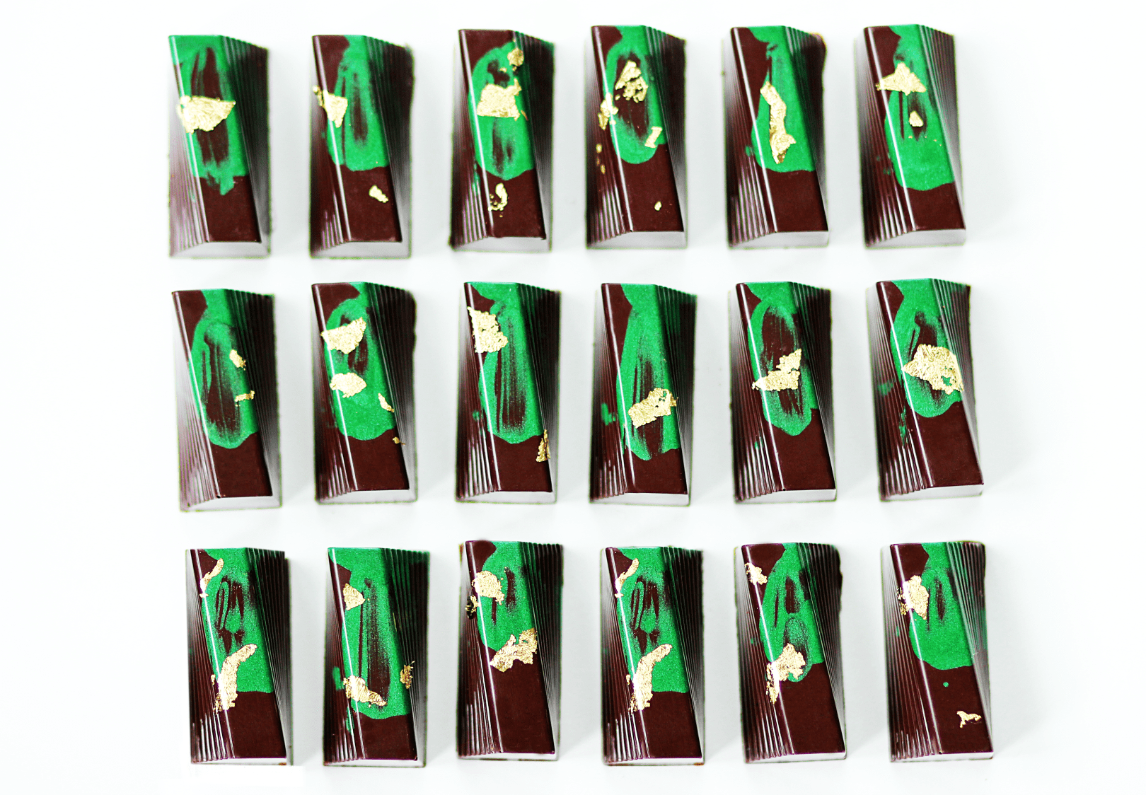 I applied the gold leaf after un-molding the finished bonbons. I use a small make-up bruss (new and make-up free) to gently place small pieces of old leaf where desired. Edible gold leaf is incredibly thin and fragile, so warning: no ceiling fans, no open windows, no fast movements. Just…don’t even breath. One enthusiastic exhale and you’ve just blown, like, $15 on the floor.